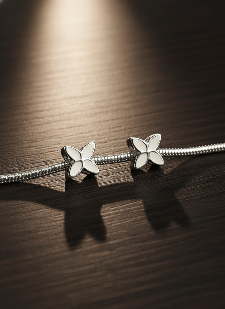 CHARM en form de fleur à 4 pétales blanches. Il est en alliage et décorés d’émail.