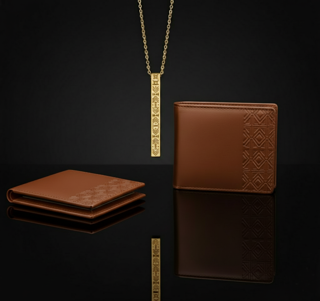 Pendentif barre unisexe OHENEBA 3D en Plaqué Or 18 carats gravures ashanti  + Portefeuille Essentiel Noir