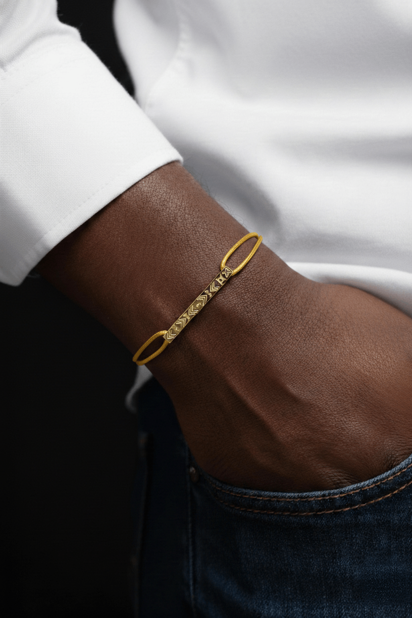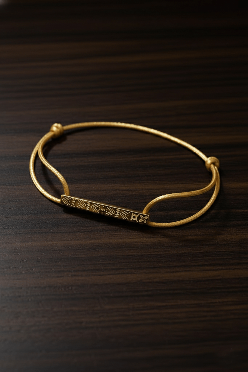 Gravée d’une succession de signes Adinkra soigneusement composés, la barre dorée crée un langage graphique à part entière — un bijou élancé, solide, mais d’une fluidité presque spirituelle.