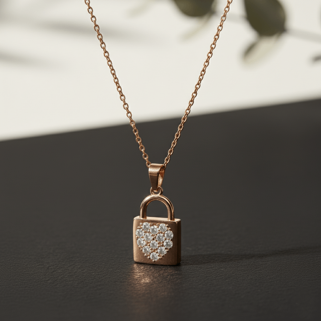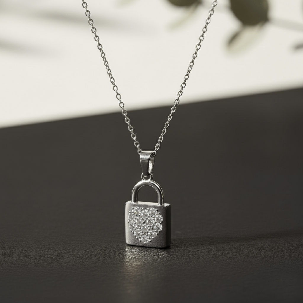 Le pendentif Lumière prend la forme d’un cadenas délicat, orné d’un cœur pavé de cristaux aux reflets subtils.